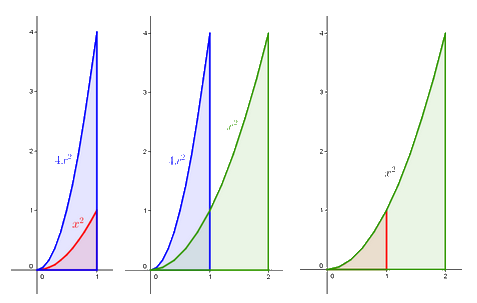 Naším záměrem je využít názornější a intuici bližší přístupy, například Cavalieriho princip. Tento princip se nejdříve objeví při počítání obsahů trojúhelníků a objemů těles. Později lze díky němu experimentovat s obsahy křivočarých útvarů určených parabolou, vodorovnou přímkou a svislou přímkou (přesněji přímkami rovnoběžnými se souřadnými osami, jde tedy o jakési „trojúhelníky s prohnutou stranou“). Studenti například zjistí, kolikrát je modrý útvar větší než červený. Poté zjistí, kolikrát je zelený útvar větší než modrý. Tím objeví poměr obsahů červeného a zeleného útvaru.
